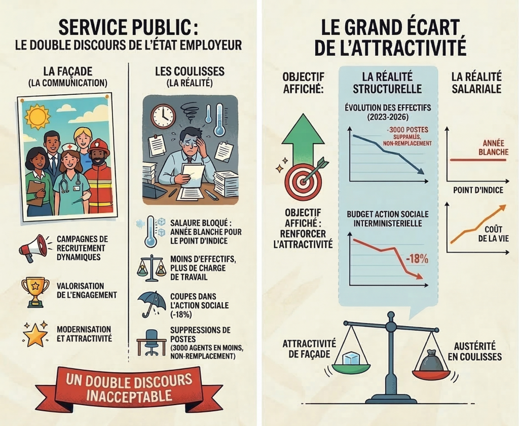 Alors que le gouvernement multiplie les grandes campagnes de communication, à l’image du Forum « Choisir le service public », pour tenter de masquer la crise des vocations, notre Fédération dénonce un double discours inacceptable. On n’attire pas de nouveaux talents avec des salaires gelés, des effectifs sous tension et des droits sociaux amputés.